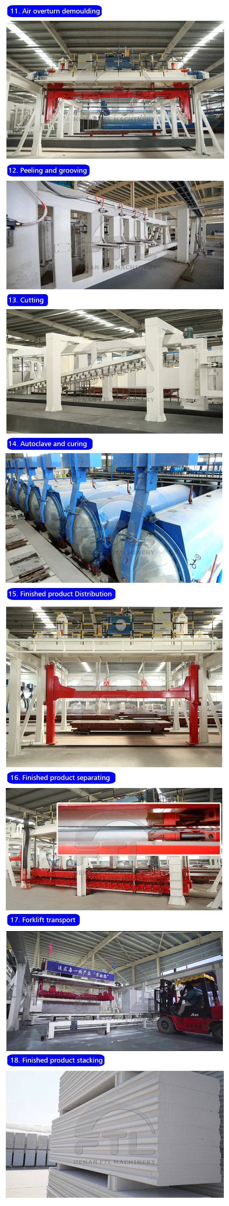 The slurry in the mould stays in the curing room for 2-3hours. The temperature in the curing room should be kept at 50-70℃. After 2-3 hours, the slurry will harden and become lumpy, but cake-like, hard and soft. First, the cake is pulled out of the curing room together with the mould, and the steel cage crane pulls the drill rod out of the cake. The cake will then be rotated 90 degrees in the air by a reverse crane and placed on the cutting cart. The cutting trolley will move to the position of the cutting machine to complete side cutting, horizontal cutting and vertical cutting.